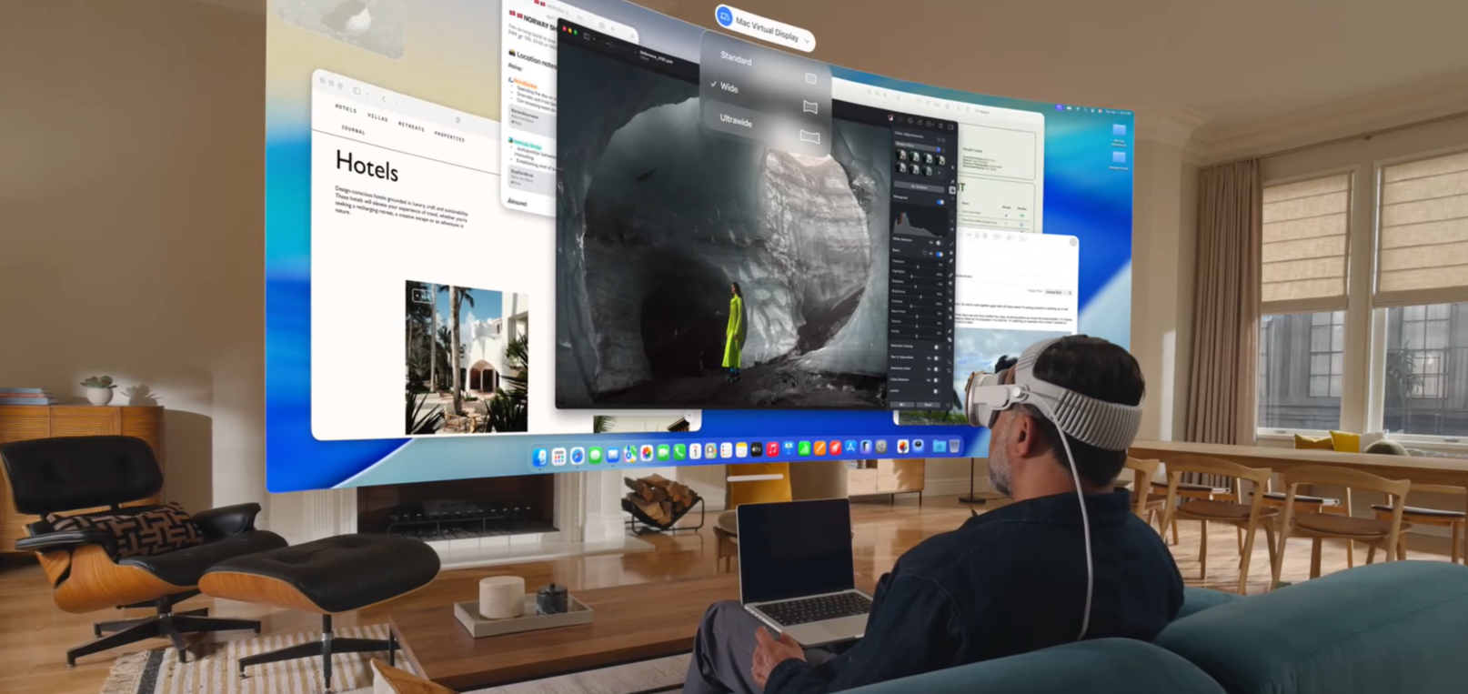 В повседневной жизни Apple Vision Pro 2 может превратить любой стол в полноценный офис или студию. В небольшой комнате или в гостинице пользователь получает перед глазами несколько виртуальных мониторов, инструменты для видеозвонков, редакторы, чат-панели и панели задач. Нет нужды в физическом многоэкранном рабочем месте — достаточно гарнитуры.