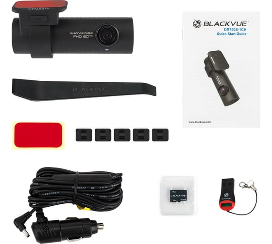 Видеорегистратор Blackvue DR750X-1CH PLUS, Запасной 3M скотч для крепления видеорегистратора, инструкция по эксплуатации, Кабель для прямого подключения CH-3P1, Кабель питания от прикуривателя 4 м, Карта памяти 32 Гб, Картридер microSD-USB, Монтажные площадки для кабеля, упаковка