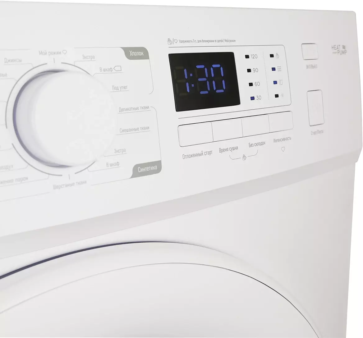 дисплей, индикация влажности белья, освещение барабана, отсрочка старта, тепловой насос