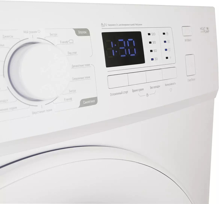 LED-дисплей, датчик влажности, подсветка барабана, реверсивное вращение, тепловой насос