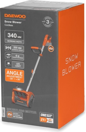 21В Li-ion единая платформа, LED фара, Бесщеточный двигатель обеспечивает высокую мощность при меньшем потреблении энергии, что позволять работать до 30% времени дольше на одном заряде аккумулятора, Бесщеточный электродвигатель, Выдерживает серьезные нагрузки и обеспечивает эффективную и бережную уборку снега до нуля с любого покрытия: асфальт, брусчатка или плитка, Делают снегоуборщик удобным для транспортировки, хранения и маневрирования, снижая физическую нагрузку при работе, Легкий вес и компактные размеры, Модель совместима со всеми аккумуляторными инструментами и батареями Daewoo линейки 21В, Направление выброса снега, Регулировка угла наклона дополнительной рукоятки позволяет подобрать оптимальное комфортное положение для работы, Регулируемая дополнительная рукоятка, Ременный привод, Ременный привод обеспечивает надежную передачу крутящего момента от двигателя к шнеку, одновременно защищая мотор от перегрузок и повреждений в случае застревания или блокировки шнекового механизма, Складная конструкция, Складная рукоятка облегчает хранение и транспортировку снегоуборщика, сокращая занимаемое пространство и повышая удобство эксплуатации, Яркая светодиодная фара освещает рабочую зону перед снегоуборщиком, обеспечивая комфортное и безопасное выполнение работ даже в условиях недостаточного освещения или ночью, Направляющие выброса снега позволяют отбрасывать снег в сторону от убираемого участка, значительно повышая чистоту и аккуратность уборки, Ударопрочный шнек