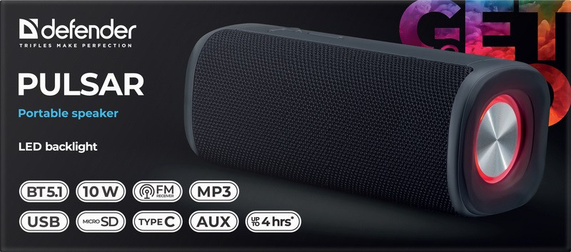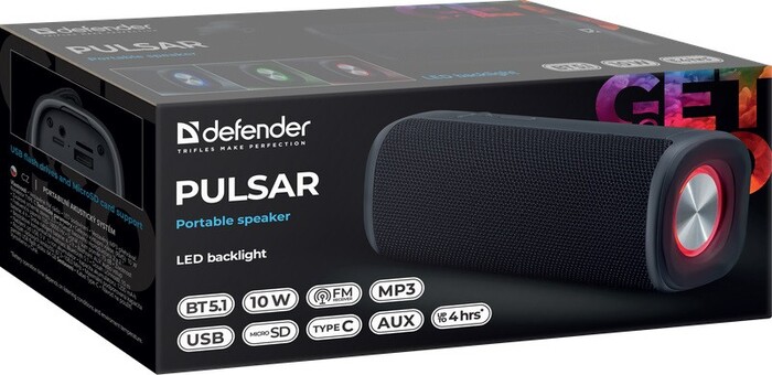 Defender Pulsar отличается практичностью и эргономичностью, удобной для повседневного использования. Модель оснащена встроенным FM-радио, световыми эффектами и поддержкой различных источников воспроизведения. Компактные размеры, ручка и ремешок делают транспортировку простой.