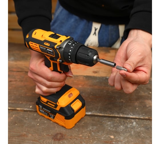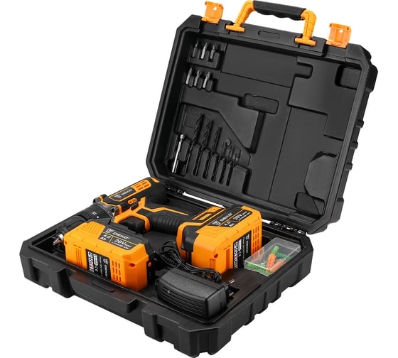 18+3 ступени крутящего момента – для аккуратного закручивания любых шурупов, 2 аккумулятора – для работы без простоев, Li-lon аккумуляторы: без эффекта памяти, без саморазряда, Аккумуляторная технология избавляет оператора от необходимости следить за шнуром питания, Быстрозажимной патрон – для простой смены оснастки, Кейс – для удобства хранения и транспортировки инструмента и принадлежностей, Удобная рукоятка – для комфортного рабочего процесса и меньшей усталости, Функция реверса упрощает выведение застрявшего в материале сверла, Щеточный двигатель быстро развивает скорость до 22000 уд/мин, успешно обрабатывая дерево, камень и металл