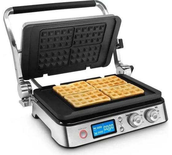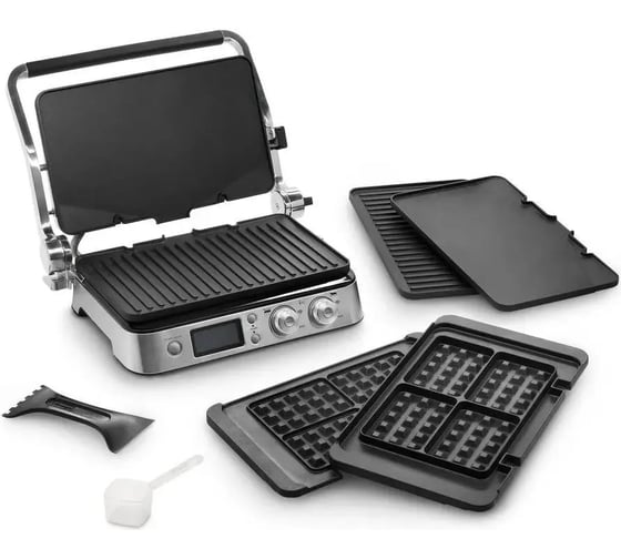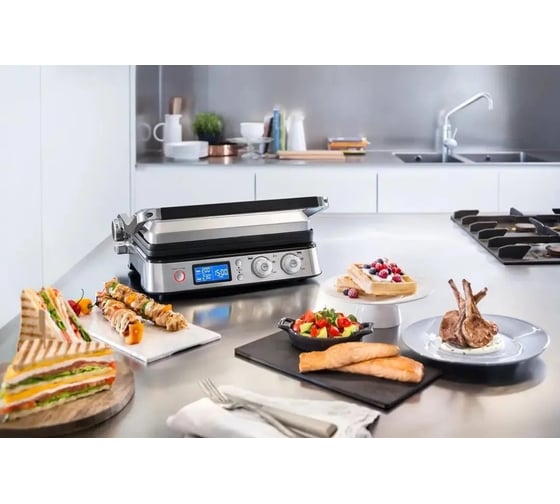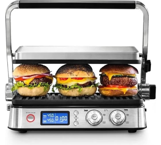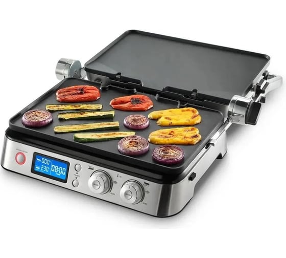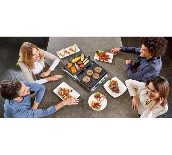 антипригарное покрытие, дисплей, индикатор нагрева, лоток для жира и сока, открытие на 180°/положение барбекю, регулировка температуры, ручка с защитой от нагревания, съемные пластины, таймер обратного отсчета, термоизолированный корпус