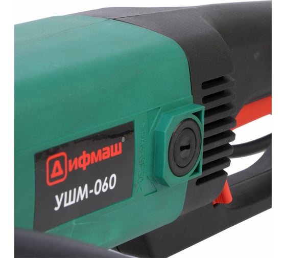 Дополнительная рукоятка для удобства работы, Кожух для защиты оператора от пыли и искр, Металлический корпус редуктора ДИФМАШ УШМ-060 для длительной эксплуатации, Независимость от заряда батареи и, соответственно, большая производительность без простоев для зарядки