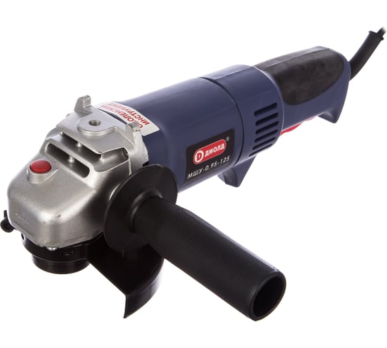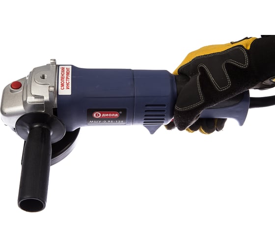 Блокировка шпинделя в ДИОЛД МШУ-0.95-125 - для удобства смены оснастки, Двойная изоляция - для защиты оператора от поражения электричеством, Защита от радиопомех, Компактная шлифмашина - для работы в условиях ограниченного пространства, Небольшой вес - для удобства работы, Основная рукоятка с резиновой вставкой - для надежного удержания инструмента, трехпозиционная дополнительная рукоятка, Электронная регулировка оборотов - для работы с разными материалами.