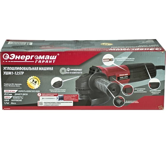 Блокировка шпинделя для простой смены оснастки, Двухпозиционная рукоятка для удобства работы в труднодоступных местах, Кожух для защиты оператора от пыли и искр, Небольшой вес для комфортной продолжительной работы, Независимость от заряда батареи и, соответственно, большая производительность без простоев для зарядки, Прочный не спутывающийся кабель, Пылезащита предохраняет электродвигатель от загрязнения, Эргономичный корпус для комфортной работы Энергомаш 125мм, 1000Вт УШМ1-125ТР