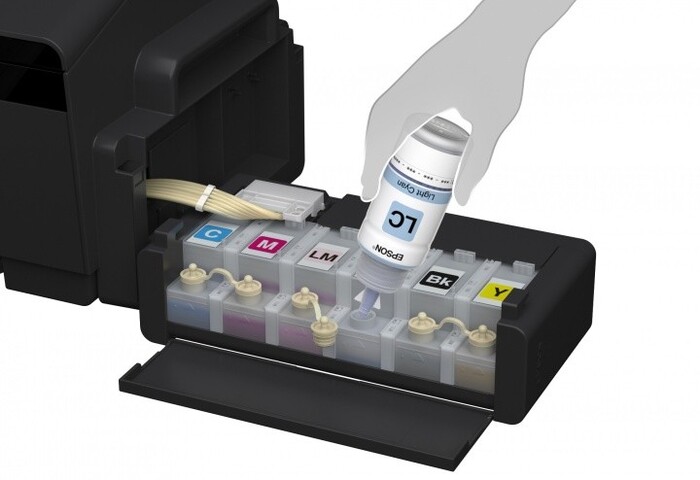 СНПЧ представлена 6-цветным градиентом, благодаря чему устройство может предельно точно передавать все оттенки оригинала. При этом Epson L1800 может похвастаться высокой экономичностью печати, ведь емкости СНПЧ можно легко заправлять оригинальным красящим пигментом — объем каждой емкости составляет 70 мл, а заводской заправки хватает на печать 1500 фотографий размером 10х15 см.