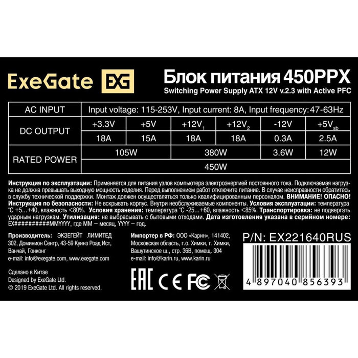 ExeGate 450PPX (EX221640RUS-S), 450 Вт