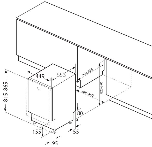 В стандартный комплект входят держатель для бокалов, корзина для посуды, лоток для столовых приборов и инструкция. Цвет корпуса – серебристый «Нержавейка», что придаёт современный и универсальный внешний вид, хорошо сочетающийся с большинством кухонных интерьеров. Установка полностью встраиваемая, что обеспечивает аккуратность и компактность установки.
