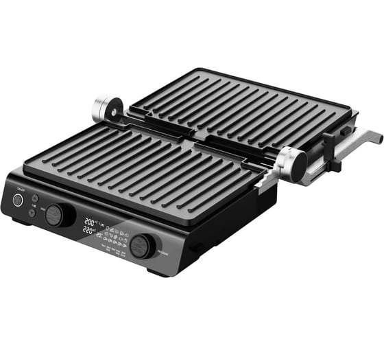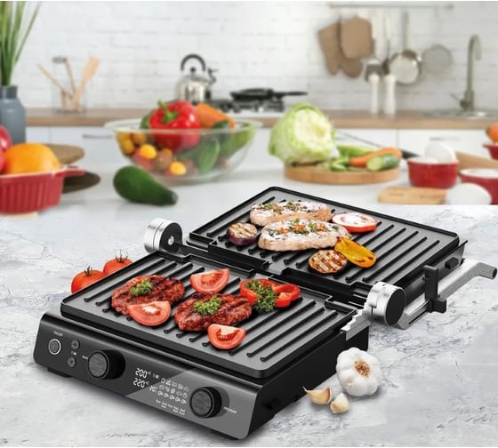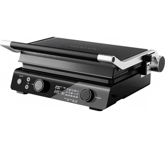 автоматическое отключение, антипригарное покрытие, дисплей, индикатор нагрева, лоток для жира и сока, открытие на 180°/положение барбекю, регулировка температуры, ручка с защитой от нагревания, съемные пластины, таймер обратного отсчета, термоизолированный корпус