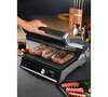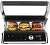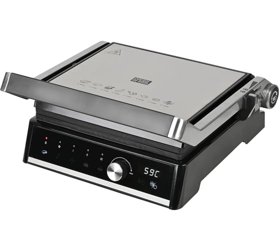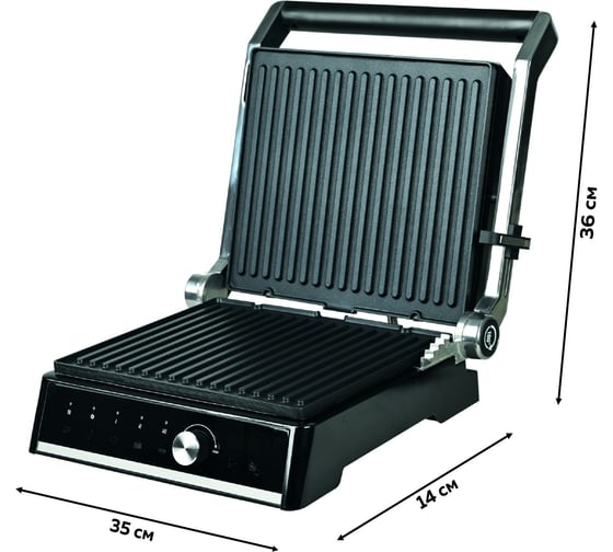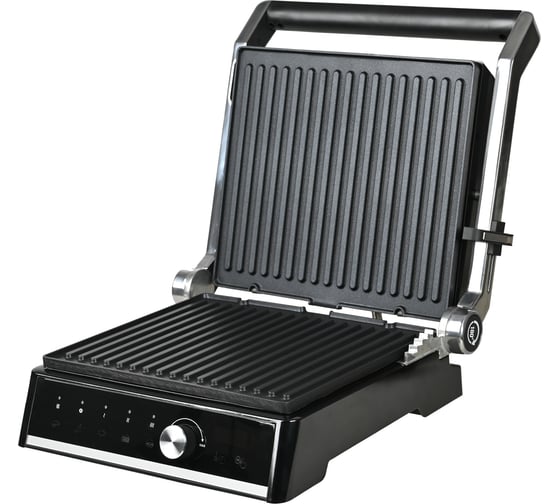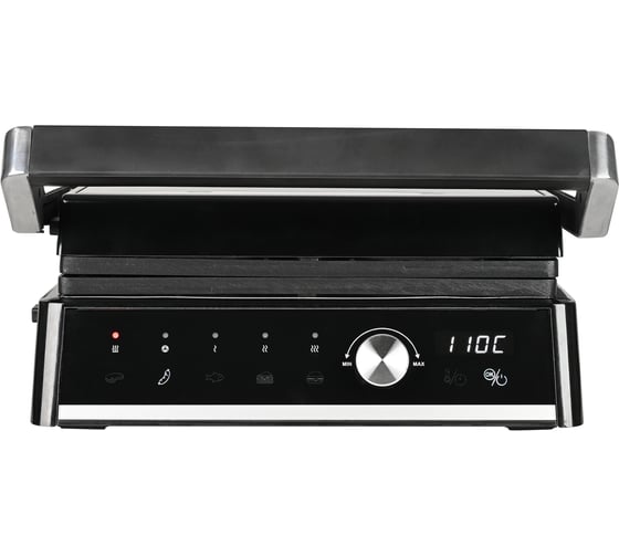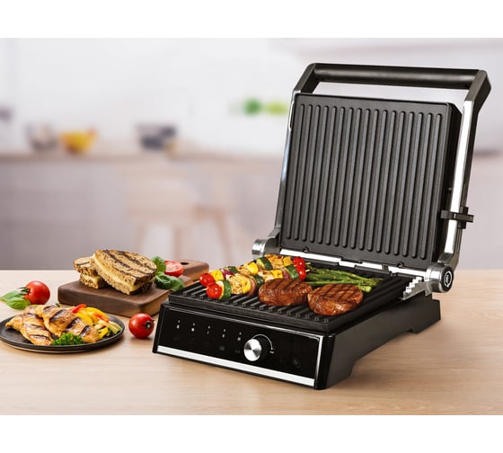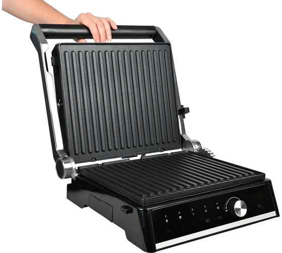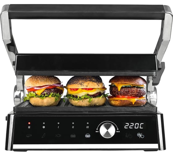 автоматическое отключение, антипригарное покрытие, дисплей, индикатор нагрева, лоток для жира и сока, открытие на 180°/положение барбекю, регулировка температуры, ручка с защитой от нагревания, съемные пластины, таймер обратного отсчета
