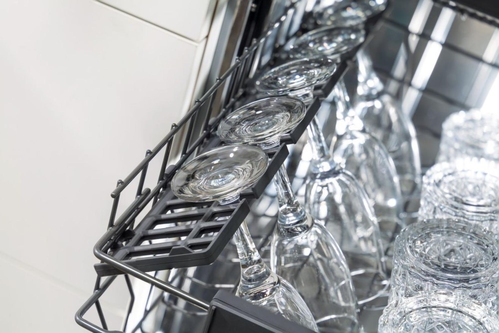Полноразмерный корпус габаритами 81.5×59.8×55 см предназначен для встраивания с полной интеграцией в кухонный гарнитур. Вместимость достигает 13 комплектов посуды, при этом корзина для столовых приборов и держатель для бокалов обеспечивают рациональное расположение элементов. Корзина с регулируемой по высоте конструкцией позволяет адаптировать внутреннее пространство под разную посуду.