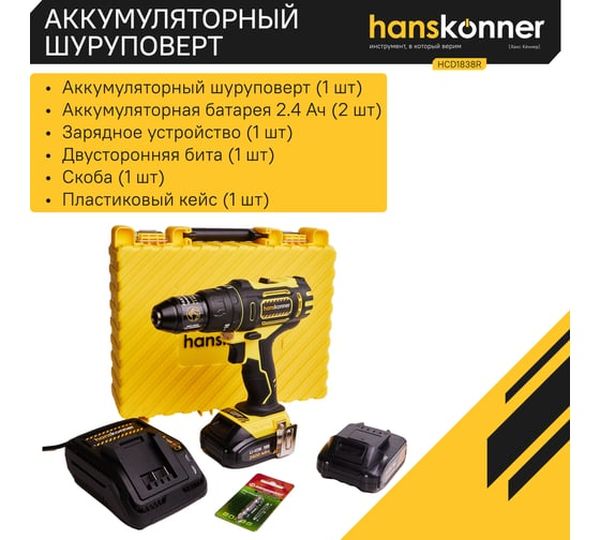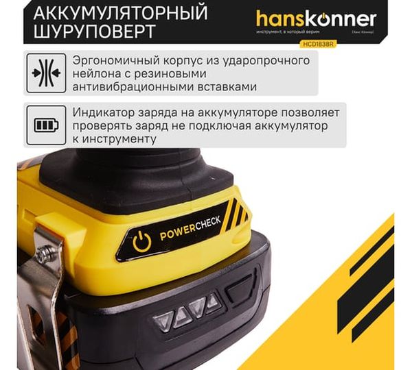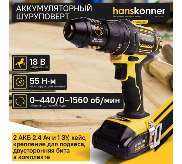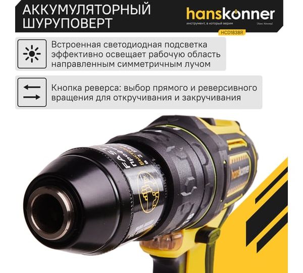 Аккумуляторная дрель-шуруповерт Hanskonner HCD1838R, 18 В, 55 Нм, 2,4 А·ч