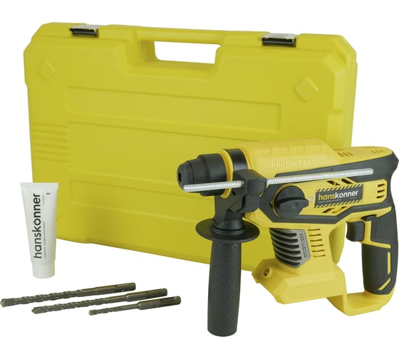 3 режима работы: сверление с ударом и без, Аккумуляторная технология избавляет оператора от необходимости следить за шнуром питания, Бесщеточный двигатель – выше мощность, дольше время работы, компактнее размеры, Буры в комплекте - можно сразу приступать к работе, Возможность поворота долота для удобства работы в режиме "Удар", Кейс для удобства хранения и транспортировки Hanskonner HRH1824BL, Патрон SDS-plus для простой смены оснастки, Подсветка рабочей зоны упрощает ведение работы в условиях недостаточной освещенности, Преимущества Hanskonner HRH1824BL, Реверс предусмотрен для легкого извлечения застрявшего бура