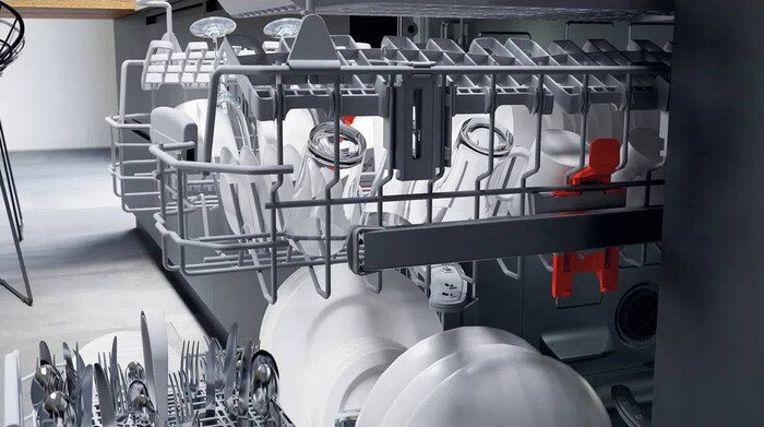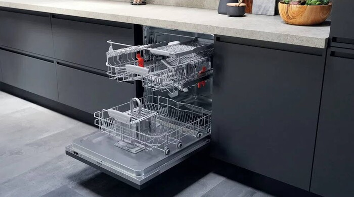 Корпус машины полноразмерный с габаритами 82×59.8×55.5 см, выполнен в серебристом цвете, полностью встраивается в мебельный ряд. Дисплей и звуковая индикация информируют о ходе и завершении цикла. Предусмотрена защита от протечек, обеспечивающая полную безопасность. Кроме того, предусмотрены регулируемая по высоте корзина для удобства размещения разной посуды и третий уровень загрузки.