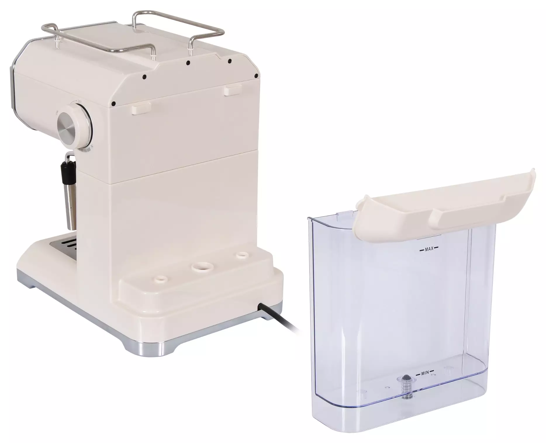 Съёмный резервуар для воды объёмом 1,5 л и съёмный поддон для капель облегчают наполнение и чистку. Индикатор уровня воды и индикатор нагрева информируют о готовности к работе. Механическое управление и отсутствие дисплея сокращают вероятность сбоев и упрощают ремонт и обслуживание.