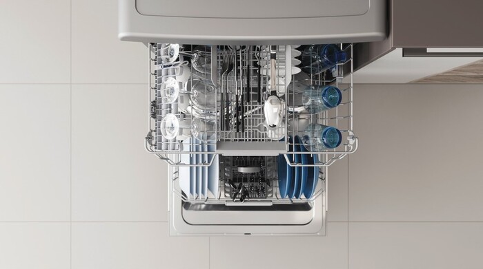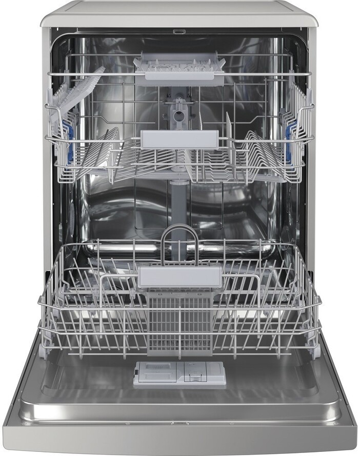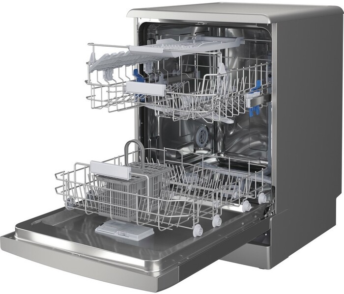 Корзина для столовых приборов регулируется по высоте, что делает размещение посуды гибким и удобным. Внутреннее пространство выполнено из нержавеющей стали, что повышает долговечность корпуса и облегчает уход за прибором. Для удобства установки устройство имеет стандартные габариты 85×60×59 см и предназначено для отдельно стоящего размещения.