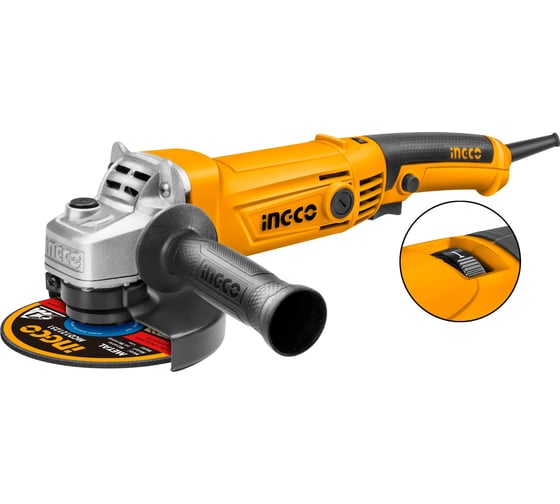 Блокировка шпинделя для простой смены оснастки, Высокая мощность INGCO AG10108-5 для тяжелых работ, Двухпозиционная дополнительная рукоятка для удобства работы, Кожух для защиты оператора от пыли и искр, Легкий доступ к щеткам – удобство самостоятельного обслуживания, Металлический корпус обеспечивает долгий срок службы, Независимость от заряда батареи и, соответственно, большая производительность без простоев для зарядки