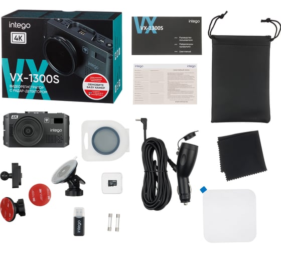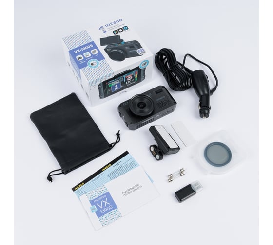 Автомобильный адаптер питания с двумя запасными предохранителями, Видеорегистратор с радар-детектором, гарантийный талон, Карта памяти MicroSD 64GB, Картридер, Легкосъемный магнитный кронштейн для крепления на лобовое стекло со встроенным модулем GPS/Glonass, Поляризационный CPL фильтр в футляре, руководство пользователя, Чехол для хранения и переноски