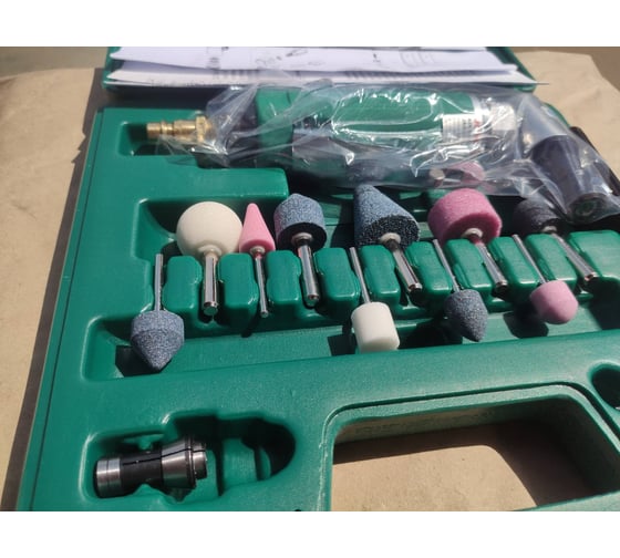 Бормашинка поставляется в кейсе, в котором ее удобно хранить и транспортировать, Встроенный глушитель - для комфортной работы оператора, Малый вес (490 граммов) - для неутомительной работы, Металлический корпус защищает внутренние узлы от повреждений и более надежен в тяжелых условиях производства, Особая форма корпуса бормашинки - для удобной работы в углах