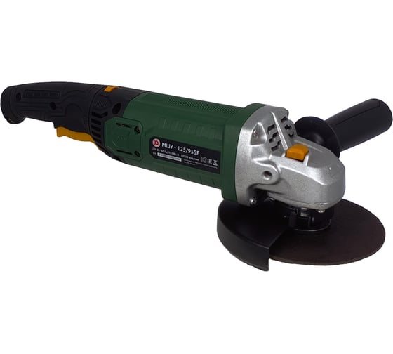Блокировка шпинделя - для простой смены оснастки, Дополнительная двухпозиционная рукоятка - для надежного удержания угловой шлифмашины Калибр МШУ 125/955Е, Класс безопасности (ГОСТ Р МЭК 60745-1-2011): II., Кожух - для защиты от пыли и искр, Легкий доступ к щеткам - для самостоятельной их замены, Регулировка оборотов - для работы с разными материалами