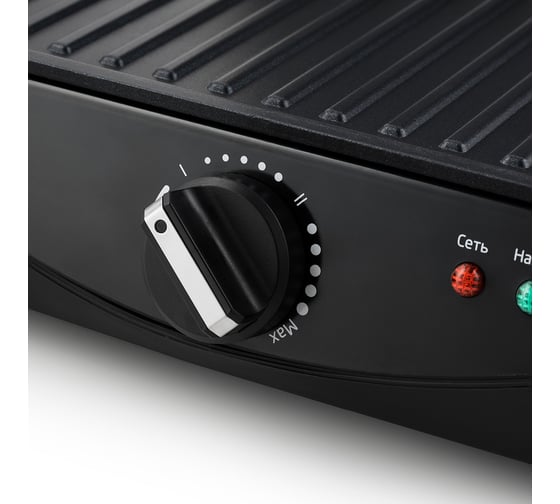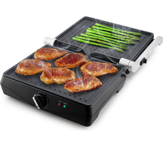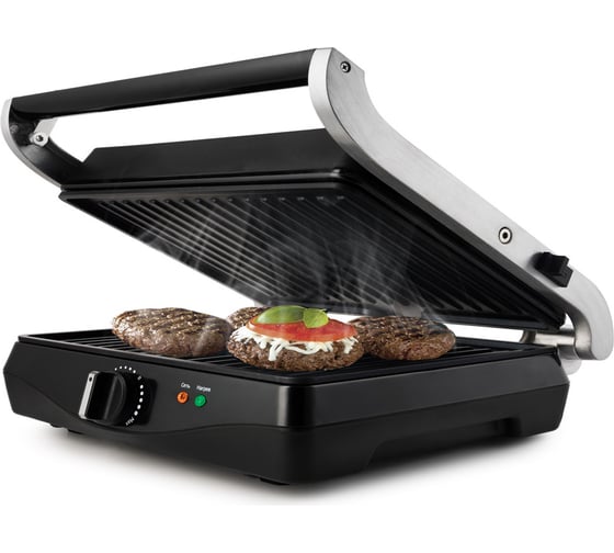 антипригарное покрытие, индикатор нагрева, лоток для жира и сока, открытие на 180°/положение барбекю, регулировка температуры, ручка с защитой от нагревания, съемные пластины, термоизолированный корпус