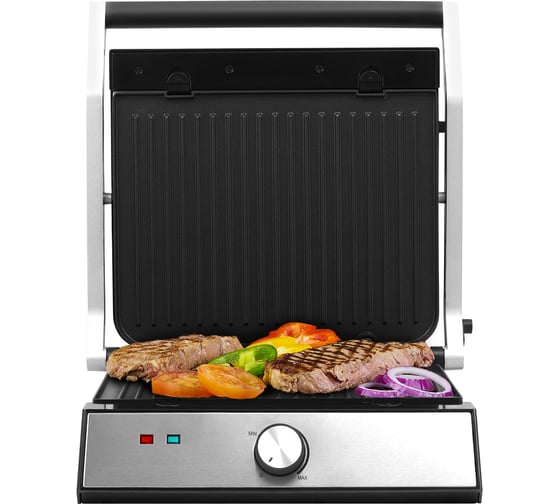 антипригарное покрытие, индикатор нагрева, лоток для жира и сока, открытие на 180°/положение барбекю, регулировка температуры, ручка с защитой от нагревания, съемные пластины