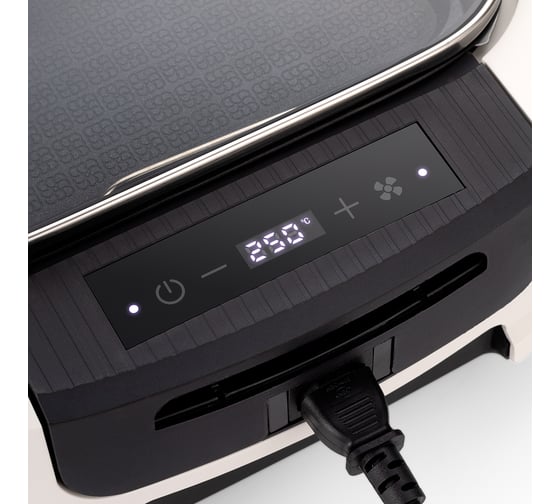 антипригарное покрытие, дисплей, индикатор нагрева, лоток для жира и сока, регулировка температуры, ручка с защитой от нагревания, съемные пластины, термоизолированный корпус