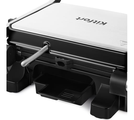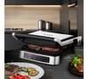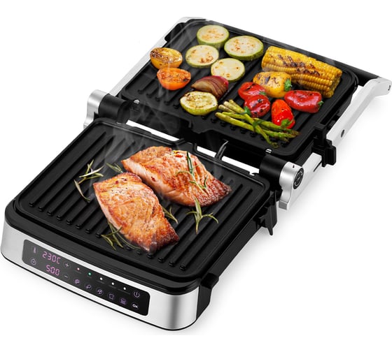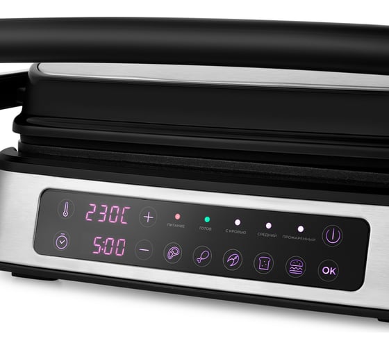 автоматическое отключение, антипригарное покрытие, дисплей, индикатор нагрева, лоток для жира и сока, открытие на 180°/положение барбекю, регулировка температуры, ручка с защитой от нагревания, съемные пластины