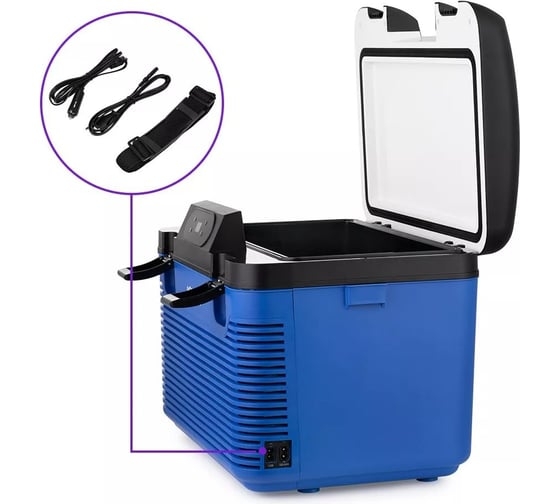 автомобильный адаптер питания, автохолодильник, документация, решетка-разделитель, сетевой кабель, съемный ремень