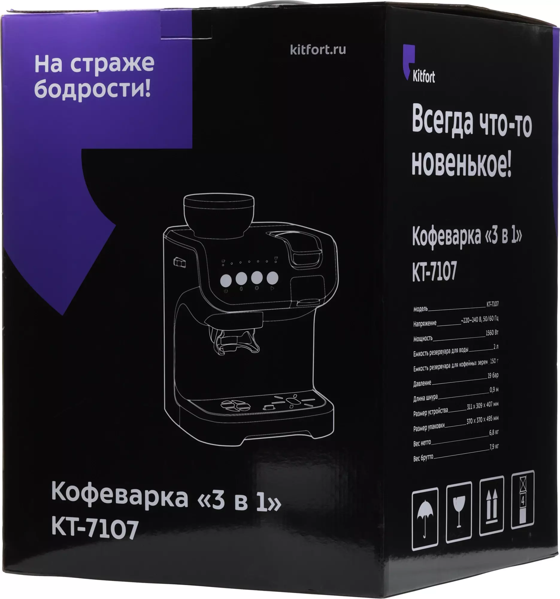 Kitfort КТ-7107 выделяется сочетанием встроенной кофемолки с возможностью работы и с молотым кофе, и с зерном, а также механиками рожковой экстракции и регулировки объёма порции. Набор съёмных модулей и индикатор уровня воды делает повседневную эксплуатацию более предсказуемой и удобной.