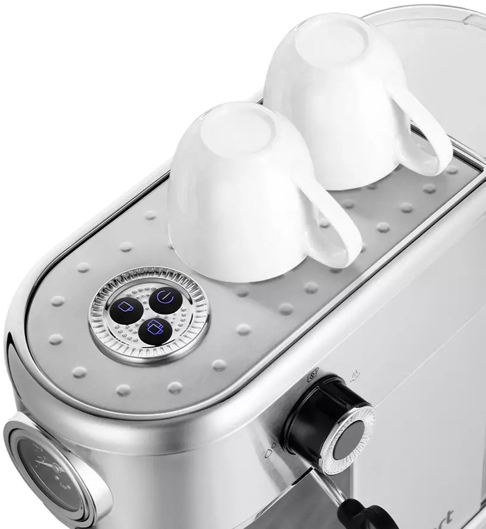 Механическая панель обеспечивает прямой доступ к функциям приготовления эспрессо и капучино, а регулировка размера порций позволяет задать нужный объём без сложных настроек. Встроенный манометр визуализирует давление в системе, индикатор нагрева и подсветка кнопок дают оперативную информацию о готовности машины. Ручной капучинатор позволяет добиваться желаемой текстуры молока, а пресс для утрамбовки молотого кофе помогает создать равномерную таблетку для стабильной экстракции.