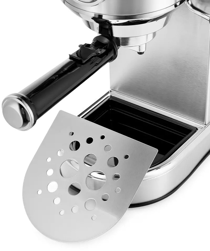 Съёмный резервуар для воды объёмом 1 литр и съёмный поддон для капель упрощают доливку и очистку, что снижает затраты времени на обслуживание. Индикатор уровня воды помогает не допустить пустого бака во время приготовления. Наличие панели для подогрева чашек позволяет заранее подготовить посуду, что влияет на сохранение температуры напитка.