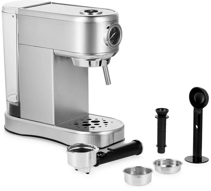Компактный корпус и простая панель управления делают машину понятной даже без опыта работы с рожковыми моделями. Наличие паровой подачи и ручного капучинатора дает возможность формировать молочную пену по собственным предпочтениям, а встроенный манометр и индикаторы помогают контролировать процесс экстракции и готовность прибора.