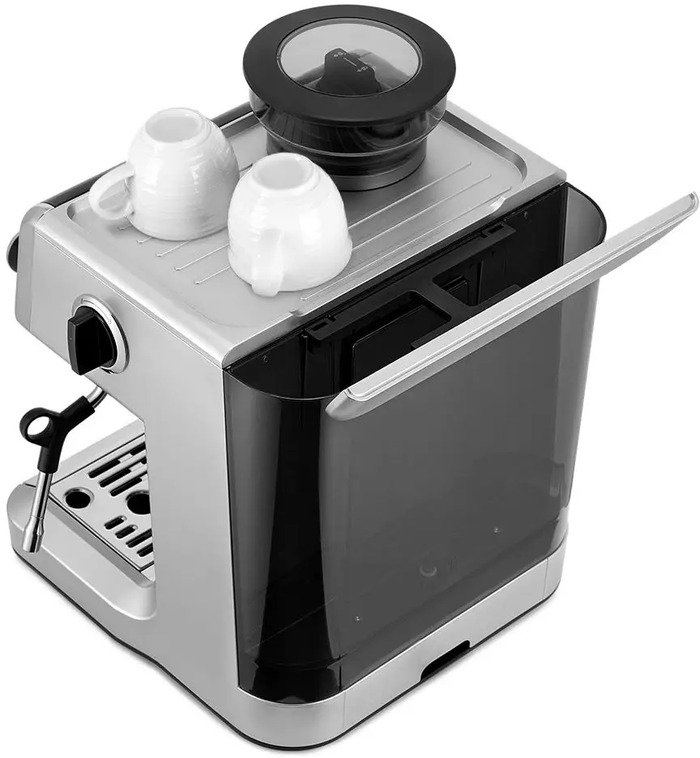 Съемный резервуар для воды и съемный поддон для капель упрощают долив и очистку, а дренажный отсек для капель облегчает поддержание внешнего вида. Подсветка кнопок управления и пенал для хранения принадлежностей повышают удобство эксплуатации. Корпус сочетает металл и пластик — это баланс внешней прочности и веса, при этом габариты и длина кабеля рассчитаны на кухонное размещение.