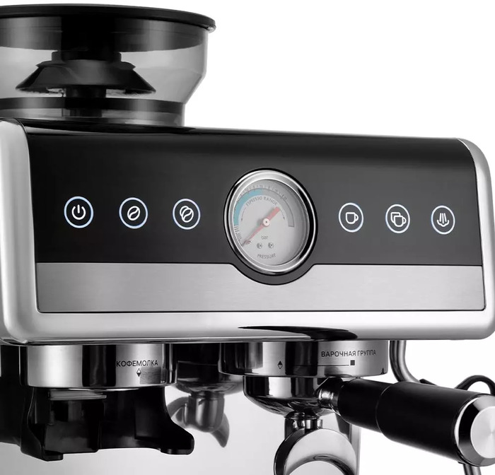 Сенсорная панель делает выбор режимов быстрым и понятным доступны приготовление эспрессо и капучино, регулировка порции и температуры воды. Бойлерный тип нагревателя в связке с давлением обеспечивает условия для плотной экстракции, а встроенный манометр помогает отслеживать рабочее давление в процессе.