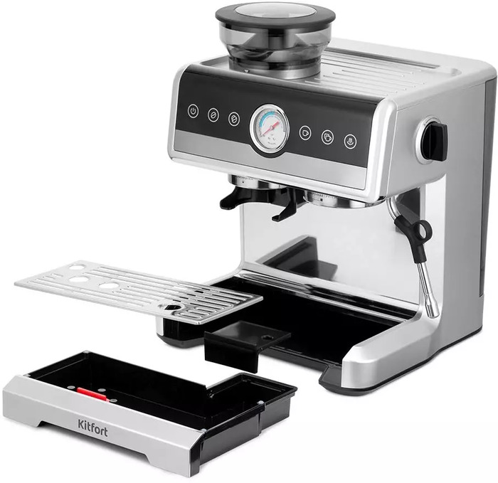 Kitfort КТ-7413 объединяет традиционный рожковый принцип с встроенной жерновой кофемолкой и бойлерным нагревом.