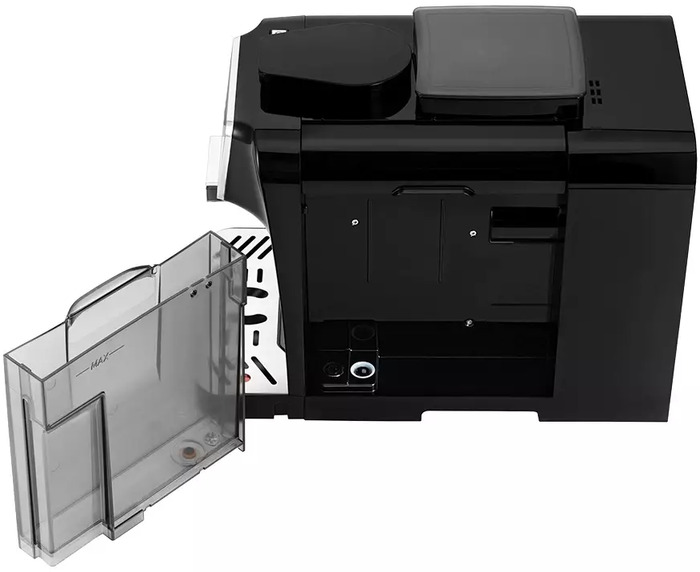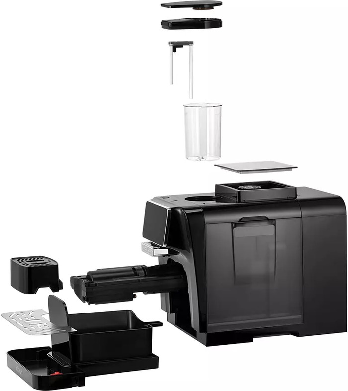 Съёмный резервуар для воды объёмом 1,5 л, отсек для отработанного кофе и съёмный дренажный отсек для капель упрощают заливку, очистку и сбор отходов. Встроенная программа самоочистки и информационный дисплей подсвечивают этапы обслуживания, а энерго‑сберегающий режим снижает нагрузку в периоды бездействия.