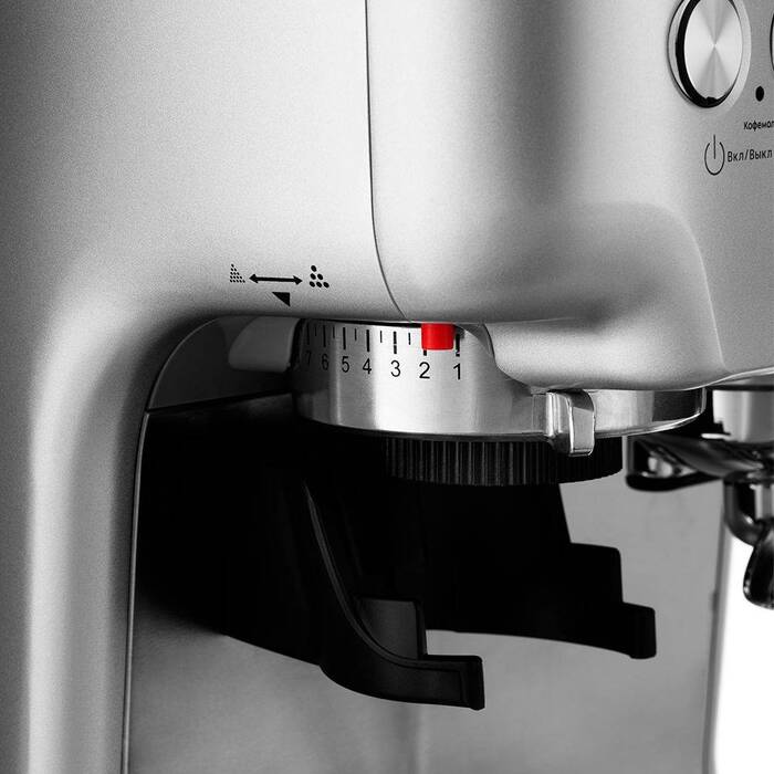 Встроенная коническая кофемолка с 15 степенями помола позволяет адаптировать крупность в соответствии с выбранным рецептом, что влияет на экстракцию и вкус. Вместимость отсека для зерен рассчитана на длительную работу без частой дозаправки, а пресс для утрамбовки молотого кофе помогает получать равномерную таблетку для устойчивой экстракции.