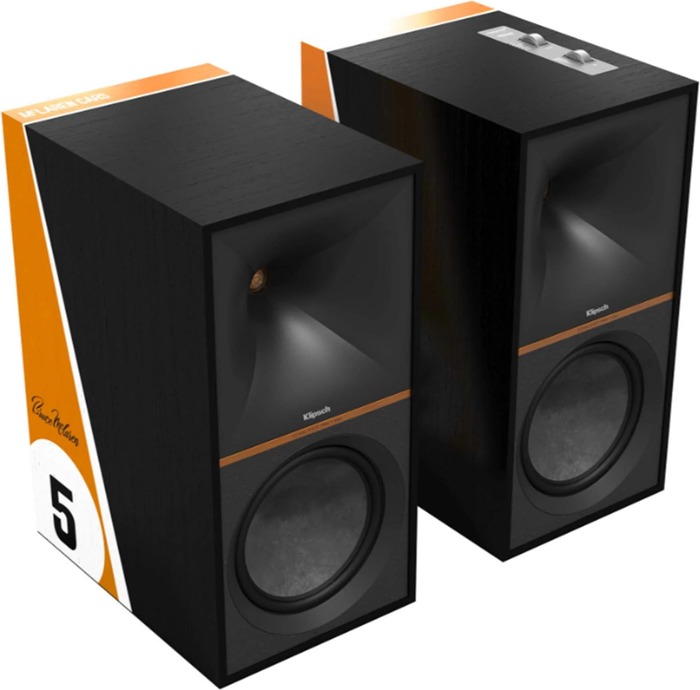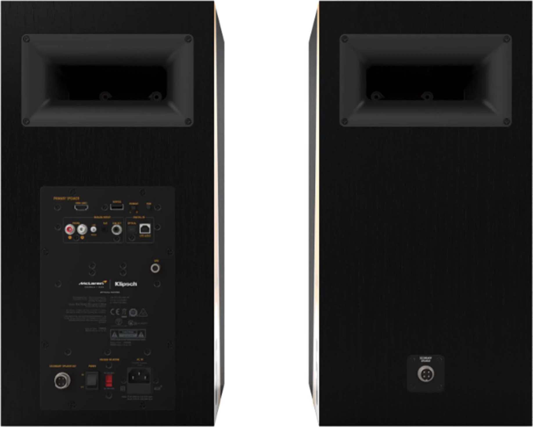 Полочная акустика Klipsch The Nines McLaren Edition в чёрном корпусе — активная 2.0 система, готовая к подключению к современным источникам звука.