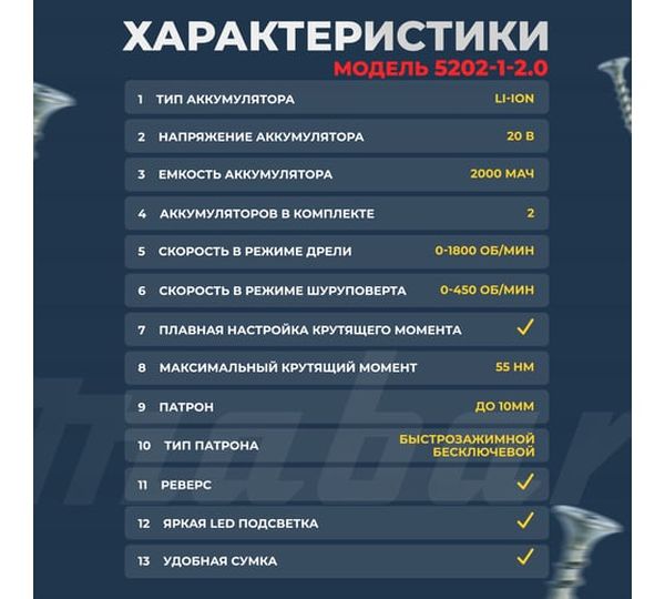 блокировка шпинделя, зарядное устройство в комплекте, индикатор уровня зарядки на корпусе дрели, наличие подсветки, наличие реверса