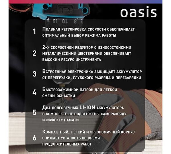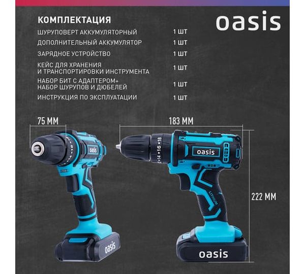 блокировка шпинделя, зарядное устройство в комплекте, индикатор уровня зарядки на корпусе дрели, наличие подсветки, наличие реверса, наличие удара, съемный патрон, тормоз двигателя