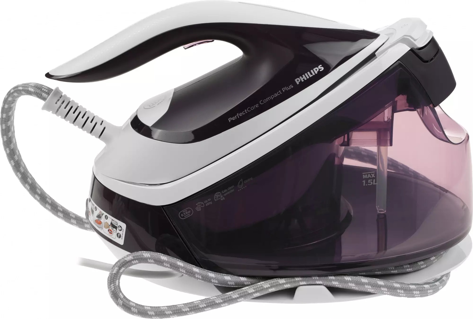 автоотключение, быстрый долив воды, вертикальное разглаживание, индикатор очистки бойлера, индикаторы наличия воды, индикаторы подачи пара, очистка от накипи, паровой удар, подходит для шелка, постоянная подача пара, съемный резервуар для воды, устройство для хранения сетевого шнура, устройство для хранения шнура для подачи пара
