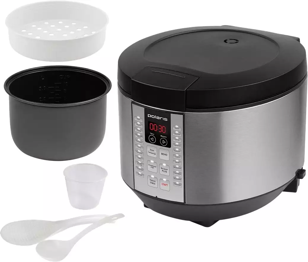В комплект входят мерный стакан, ложка и контейнер для приготовления на пару — это позволяет начать готовить без дополнительных покупок. Документация и интуитивный электронный интерфейс ускоряют освоение устройства. Поддержание тепла удерживает готовое блюдо в рабочем состоянии до подачи, а отложенный старт позволяет синхронизировать готовку с расписанием.