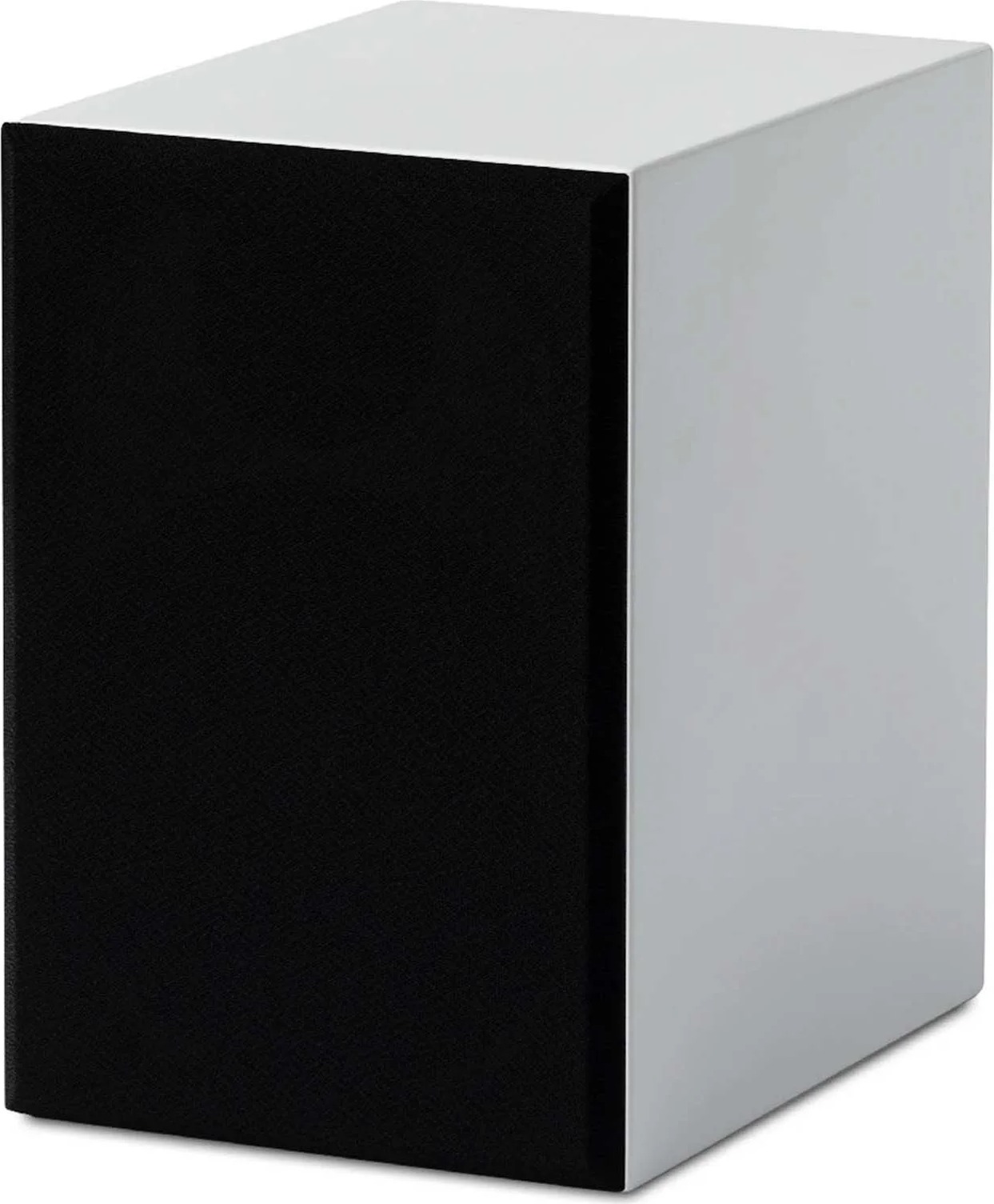 Кабинет из МДФ в белом глянце придаёт аккуратный внешний вид и снижает резонансы по сравнению с тонкими материалами. Заднее расположение фазоинвертора и компактные габариты (высота 106 мм, ширина 160 мм, глубина 152 мм) определяют варианты установки на полке, в тумбе или в составе мебели. Съёмные панели позволяют менять внешний вид без вмешательства в акустику.