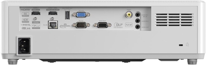Проектор оснащён крупным объективом и вентиляционными отверстиями, обеспечивающими эффективное охлаждение, что важно для стабильной работы при интенсивном использовании. Множество разъёмов для подключения расположены сзади и сбоку, что упрощает интеграцию с оборудованием и позволяет скрыть кабели для аккуратного монтажа.