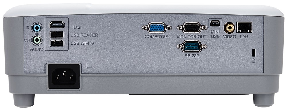 Интерфейс подключения представлен разнообразием портов: HDMI, VGA, композитный видео-вход, аудио-вход и выход, что делает проектор совместимым с широким спектром устройств — от ноутбуков и ПК до медиаплееров и игровых приставок.