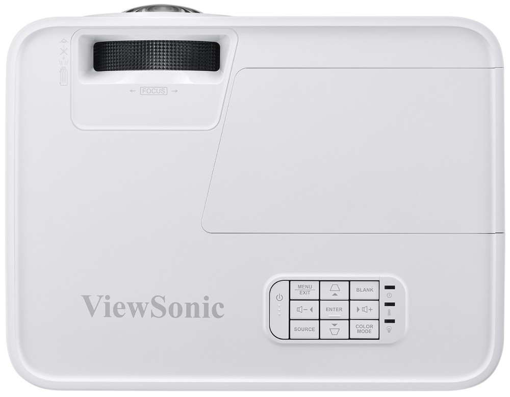 Дизайн проектора ViewSonic PS501W — это удачное сочетание простоты и продуманной функциональности. Корпус выполнен с плавными линиями и слегка скруглёнными углами, что придаёт проектору современный и элегантный вид, не перегружая его деталями.