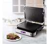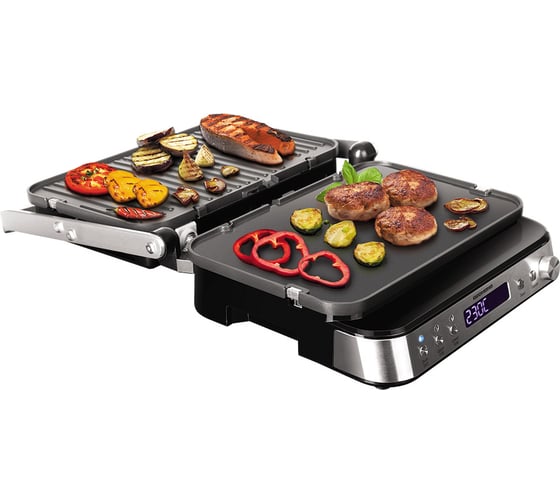 автоматическое отключение, антипригарное покрытие, дисплей, индикатор нагрева, лоток для жира и сока, открытие на 180°/положение барбекю, регулировка температуры, ручка с защитой от нагревания, съемные пластины, таймер обратного отсчета, термоизолированный корпус